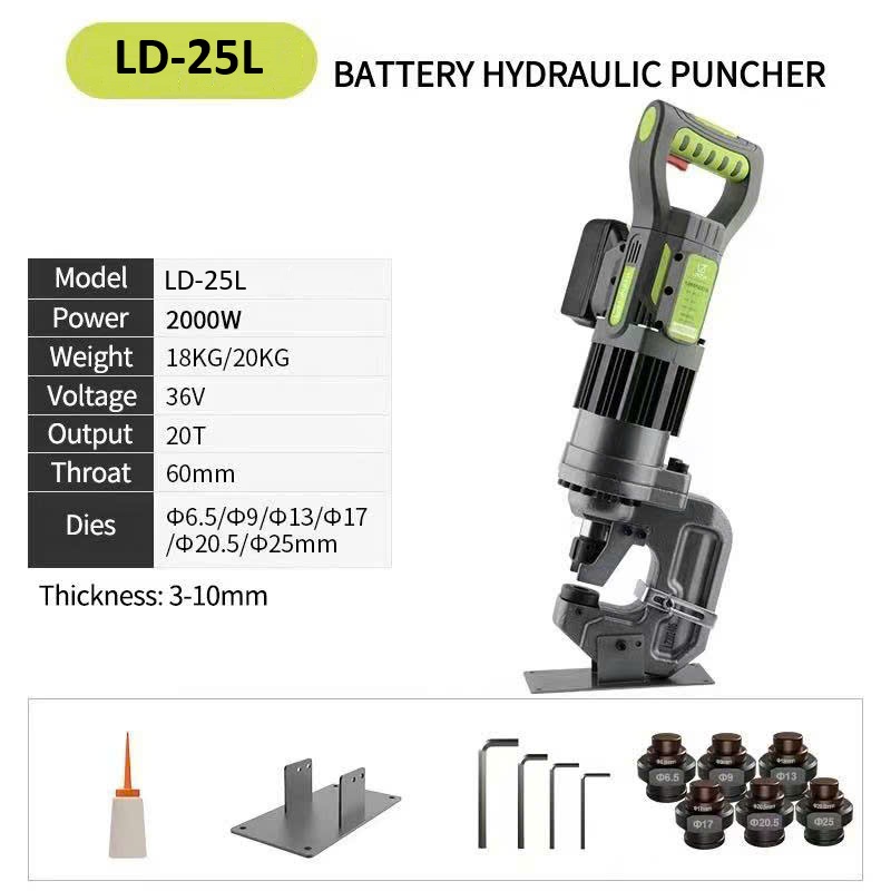 Máy đột lỗ cầm tay dùng Pin LD-25L đột được nhiều loại sắt thép kênh U V và Nhôm đồng sắt dày 10mm bằng hệ thống thủy lực hiệu quả cao.